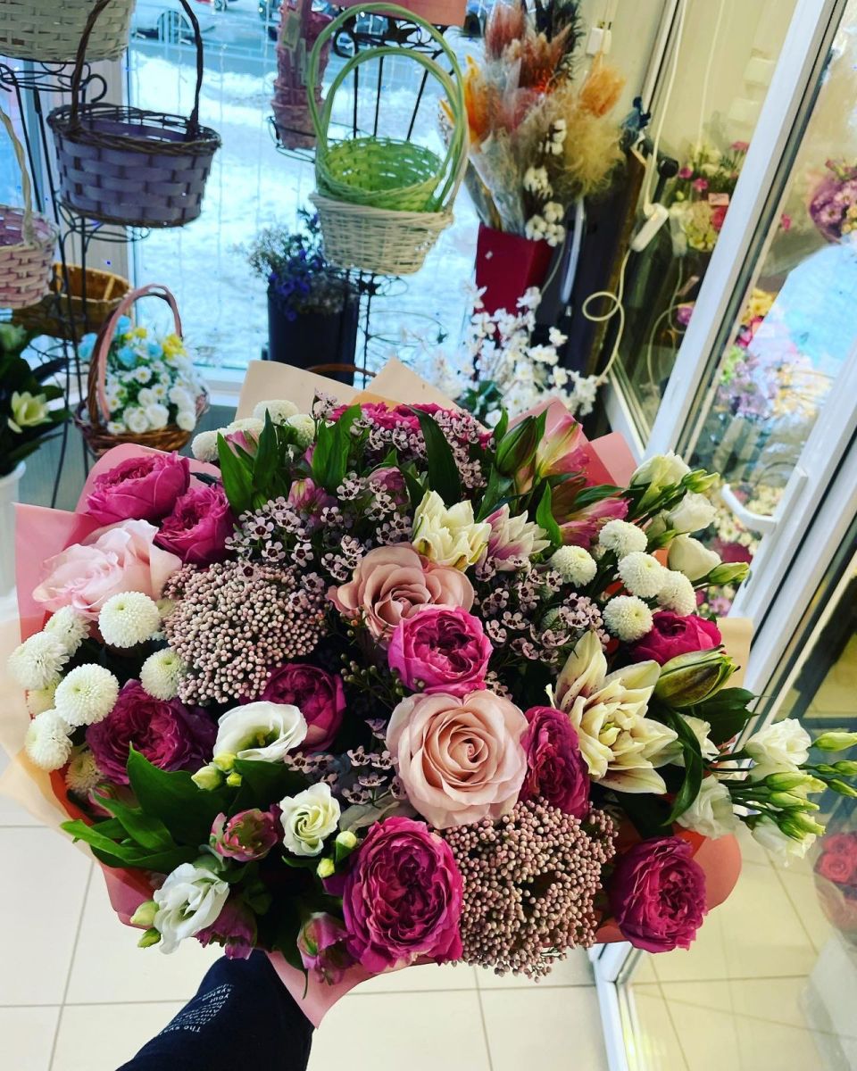 Букет «Роза микс с кустовой хризантемой, седумом и гвоздикой»