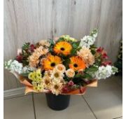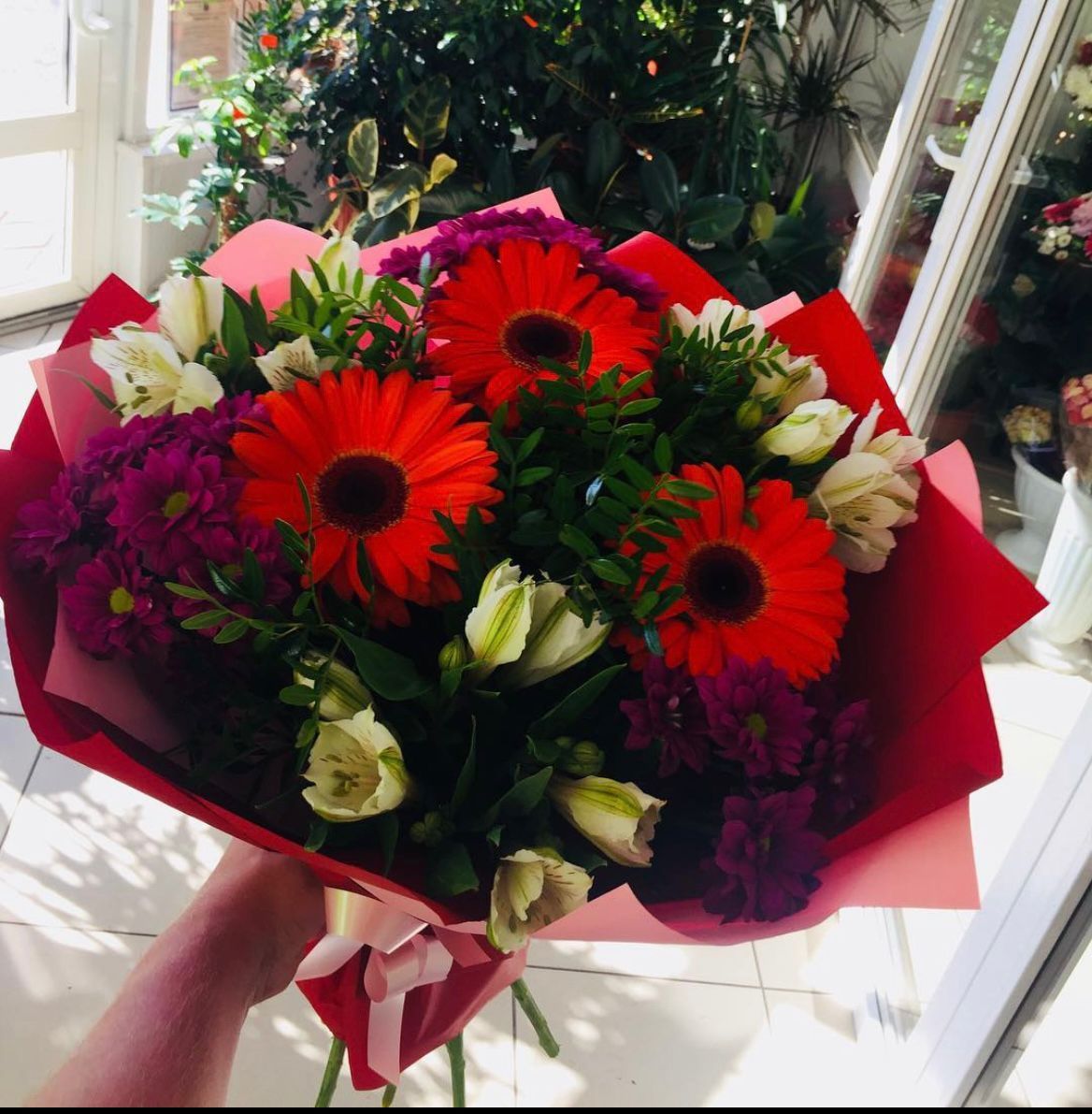 Букет «Роза микс с кустовой хризантемой, альстромерией и рускусом с папоротником»