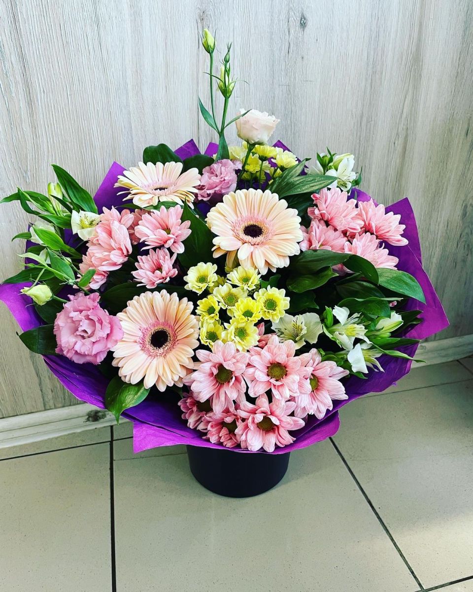 Букет «Роза микс с кустовой хризантемой, альстромерией и рускусом с папоротником»